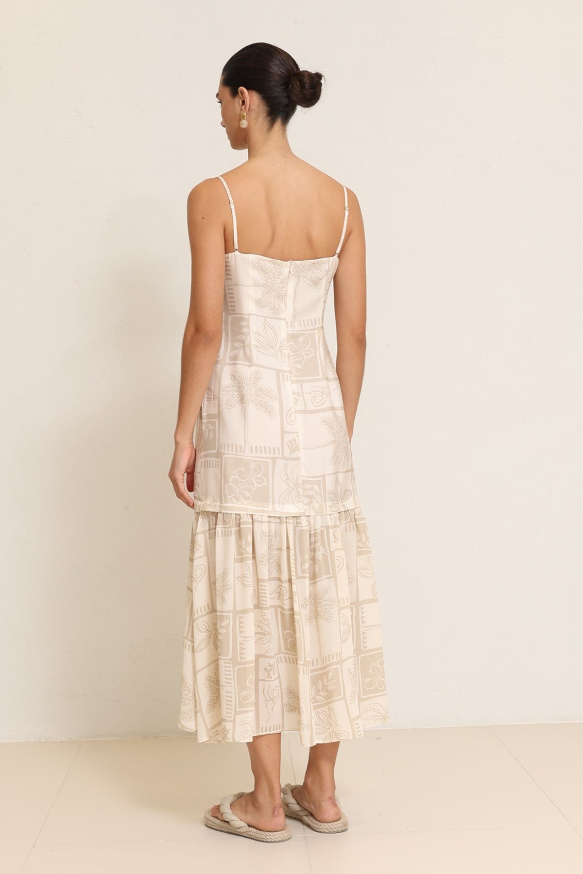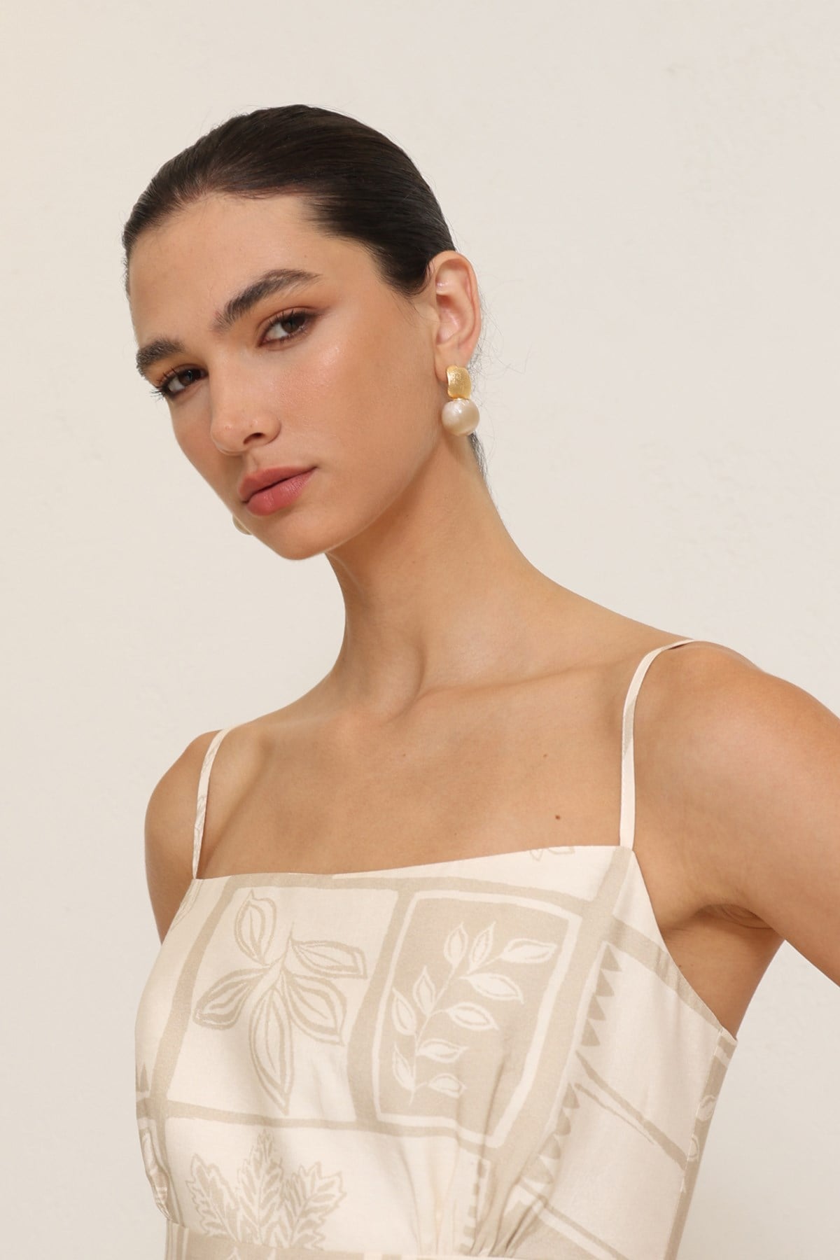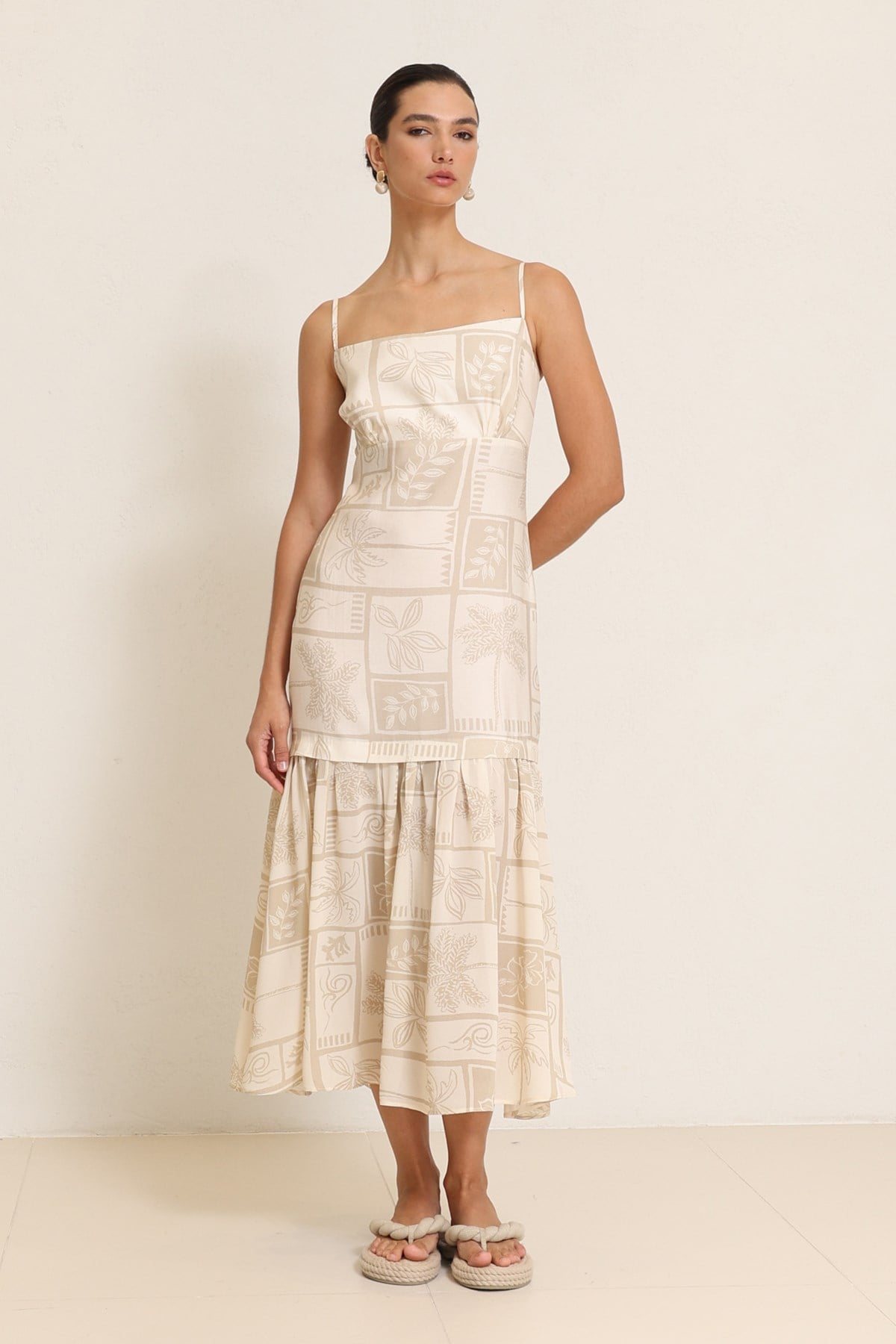 Bej İnce Askılı Etek Detaylı Desenli Elbise